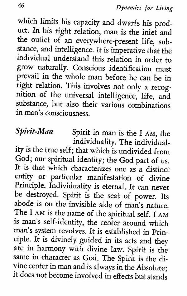 Spirit in man is the I AM, the individuality. The individuality is the true self; that which is undivided from God; our spiritual identity; the God part of us. It is that which characterizes one as a distinct entity or particular manifestation of divine Principle. Individuality is eternal. It can never be destroyed. Spirit is the seat of power. Its abode is on the invisible side of man's nature. The I AM is the name of the spiritual self. I AM is man's self-identity, the center around which man's system revolves. It is established in Principle. It is divinely guided in its acts and they are in harmony with divine law. Spirit is the same in character as God. The Spirit is the divine center in man and is always in the Absolute; it does not become involved in effects but stands