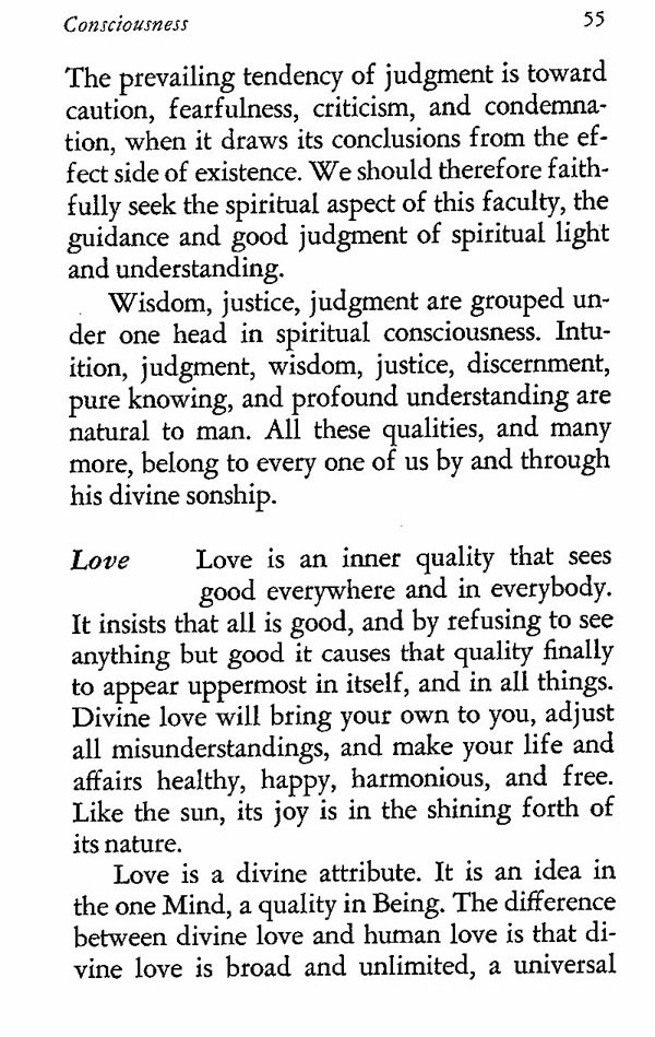 Wisdom, justice, judgment are grouped under one head in spiritual consciousness. Intuition, judgment, wisdom, justice, discernment, pure knowing, and profound understanding are natural to man. All these qualities, and many more, belong to every one of us by and through his divine sonship.