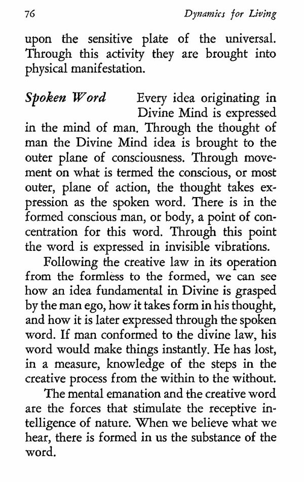 Following the creative law in its operation from the formless to the formed, we can see how an idea fundamental in Divine is grasped by the man ego, how it takes form in his thought, and how it is later expressed through the spoken word. If man conformed to the divine law, his word would make things instantly. He has lost, in a measure, knowledge of the steps in the creative process from the within to the without.