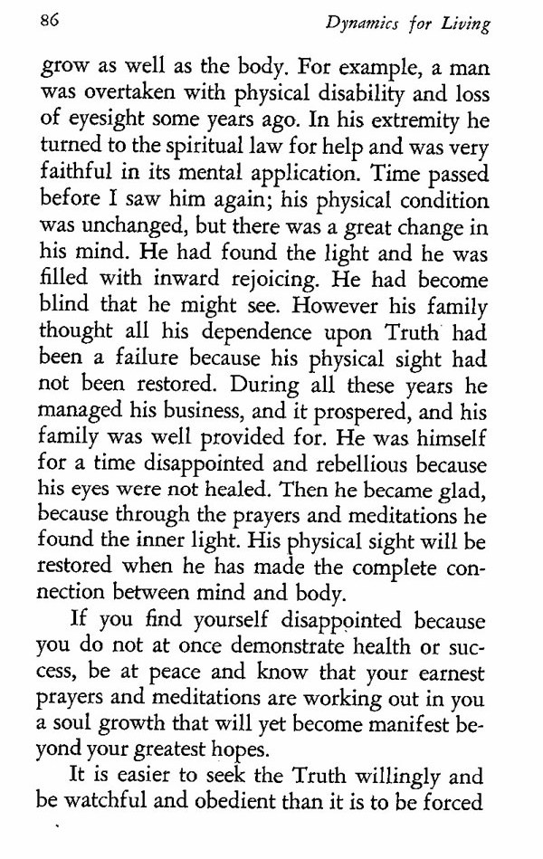 grow as well as the body. For example, a man was overtaken with physical disability and loss of eyesight some years ago. In his extremity he turned to the spiritual law for help and was very faithful in its mental application. Time passed before I saw him again; his physical condition was unchanged, but there was a great change in his mind. He had found the light and he was filled with inward rejoicing. He had become blind that he might see. However his family thought all his dependence upon Truth had been a failure because his physical sight had not been restored. During all these years he managed his business, and it prospered, and his family was well provided for. He was himself for a time disappointed and rebellious because his eyes were not healed. Then he became glad, because through the prayers and meditations he found the inner light. His physical sight will be restored when he has made the complete connection between mind and body.