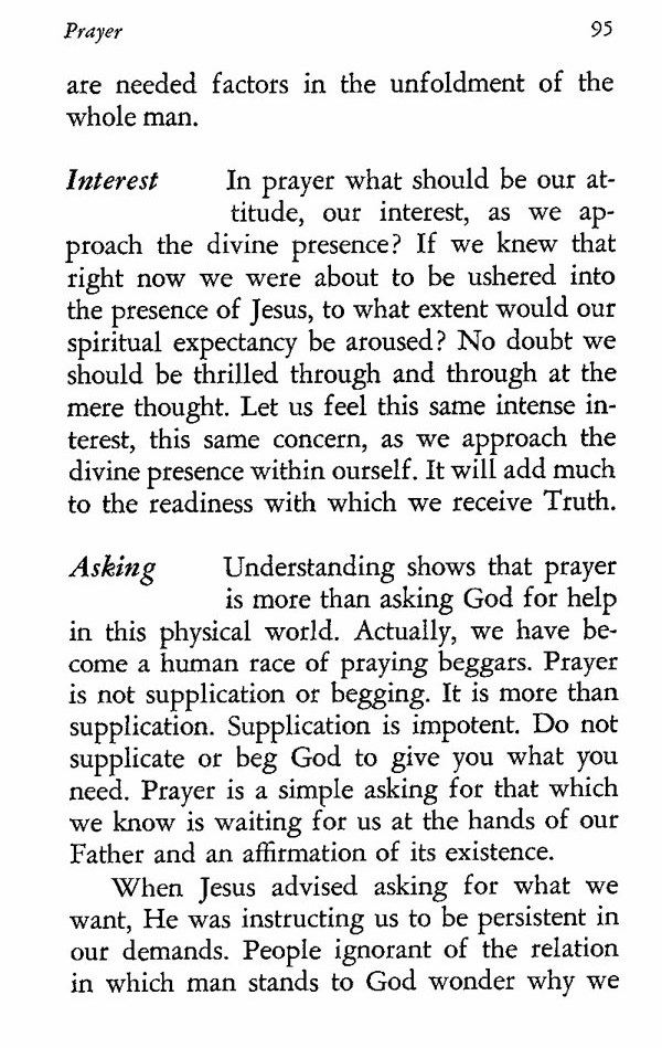 Understanding shows that prayer is more than asking God for help in this physical world. Actually, we have become a human race of praying beggars. Prayer is not supplication or begging. It is more than supplication. Supplication is impotent. Do not supplicate or beg God to give you what you need. Prayer is a simple asking for that which we know is waiting for us at the hands of our Father and an affirmation of its existence.
