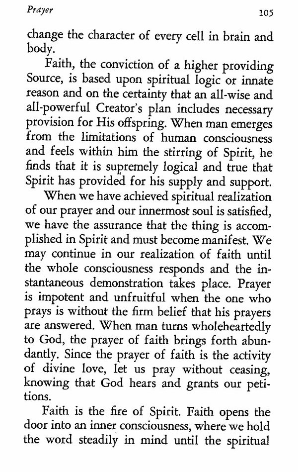 When we have achieved spiritual realization of our prayer and our innermost soul is satisfied, we have the assurance that the thing is accomplished in Spirit and must become manifest. We may continue in our realization of faith until the whole consciousness responds and the instantaneous demonstration takes place. Prayer is impotent and unfruitful when the one who prays is without the firm belief that his prayers are answered. When man turns wholeheartedly to God, the prayer of faith brings forth abundantly. Since the prayer of faith is the activity of divine love, let us pray without ceasing, knowing that God hears and grants our petitions.