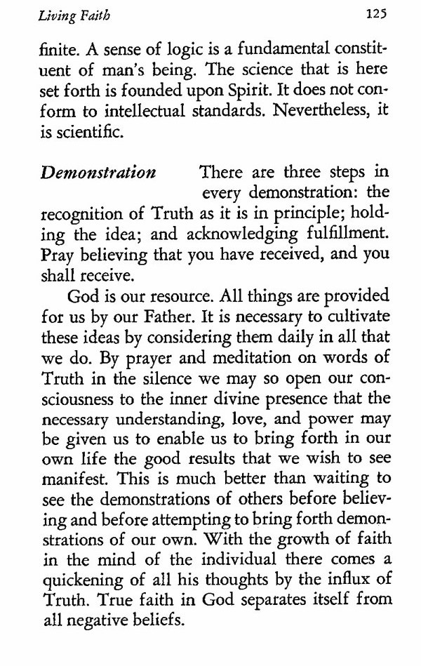 There are three steps in every demonstration: the recognition of Truth as it is in principle; holding the idea; and acknowledging fulfillment. Pray believing that you have received, and you shall receive.