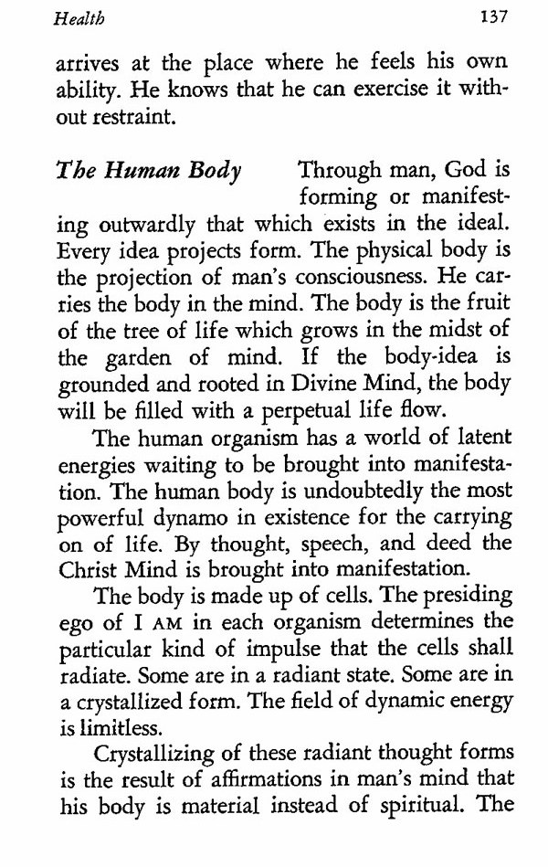 The body is made up of cells. The presiding ego of I AM in each organism determines the particular kind of impulse that the cells shall radiate. Some are in a radiant state. Some are in a crystallized form. The field of dynamic energy is limitless.