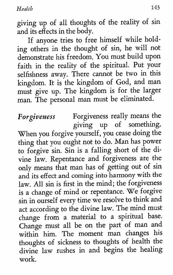 Forgiveness really means the giving up of something. When you forgive yourself, you cease doing the thing that you ought not to do. Man has power to forgive sin. Sin is a falling short of the divine law. Repentance and forgiveness are the only means that man has of getting out of sin and its effect and coming into harmony with the law. All sin is first in the mind; the forgiveness is a change of mind or repentance. We forgive sin in ourself every time we resolve to think and act according to the divine law. The mind must change from a material to a spiritual base. Change must all be on the part of man and within him. The moment man changes his thoughts of sickness to thoughts of health the divine law rushes in and begins the healing work.