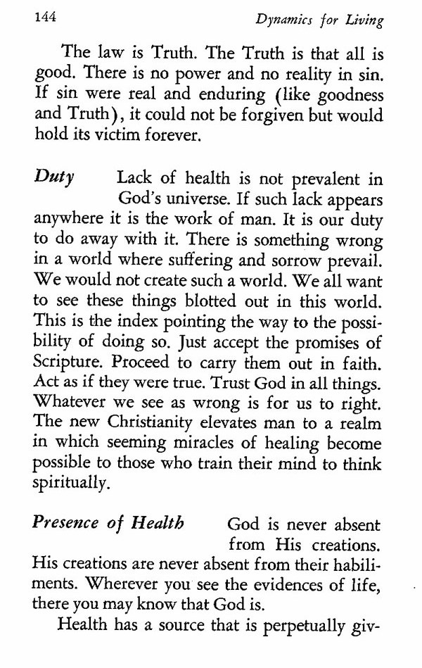 Lack of health is not prevalent in God's universe. If such lack appears anywhere it is the work of man. It is our duty to do away with it. There is something wrong in a world where suffering and sorrow prevail. We would not create such a world. We all want to see these things blotted out in this world. This is the index pointing the way to the possibility of doing so. Just accept the promises of Scripture. Proceed to carry them out in faith. Act as if they were true. Trust God in all things. Whatever we see as wrong is for us to right. The new Christianity elevates man to a realm in which seeming miracles of healing become possible to those who train their mind to think spiritually.