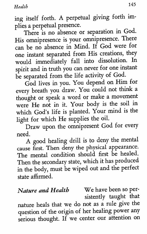 A good healing drill is to deny the mental cause first. Then deny the physical appearance. The mental condition should first be healed. Then the secondary state, which it has produced in the body, must be wiped out and the perfect state affirmed.
