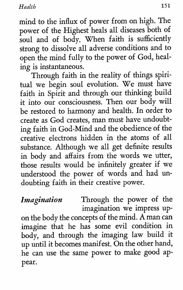 mind to the influx of power from on high. The power of the Highest heals all diseases both of soul and of body. When faith is sufficiently strong to dissolve all adverse conditions and to open the mind fully to the power of God, healing is instantaneous.