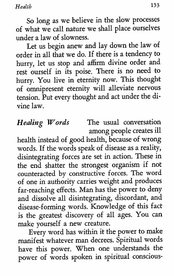 The usual conversation among people creates ill health instead of good health, because of wrong words. If the words speak of disease as a reality, disintegrating forces are set in action. These in the end shatter the strongest organism if not counteracted by constructive forces. The word of one in authority carries weight and produces far-reaching effects. Man has the power to deny and dissolve all disintegrating, discordant, and disease-forming words. Knowledge of this fact is the greatest discovery of all ages. You can make yourself a new creature.