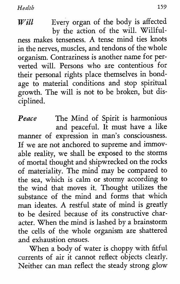 Every organ of the body is affected by the action of the will. Willfulness makes tenseness. A tense mind ties knots in the nerves, muscles, and tendons of the whole organism. Contrariness is another name for perverted will. Persons who are contentious for their personal rights place themselves in bondage to material conditions and stop spiritual growth. The will is not to be broken, but disciplined.