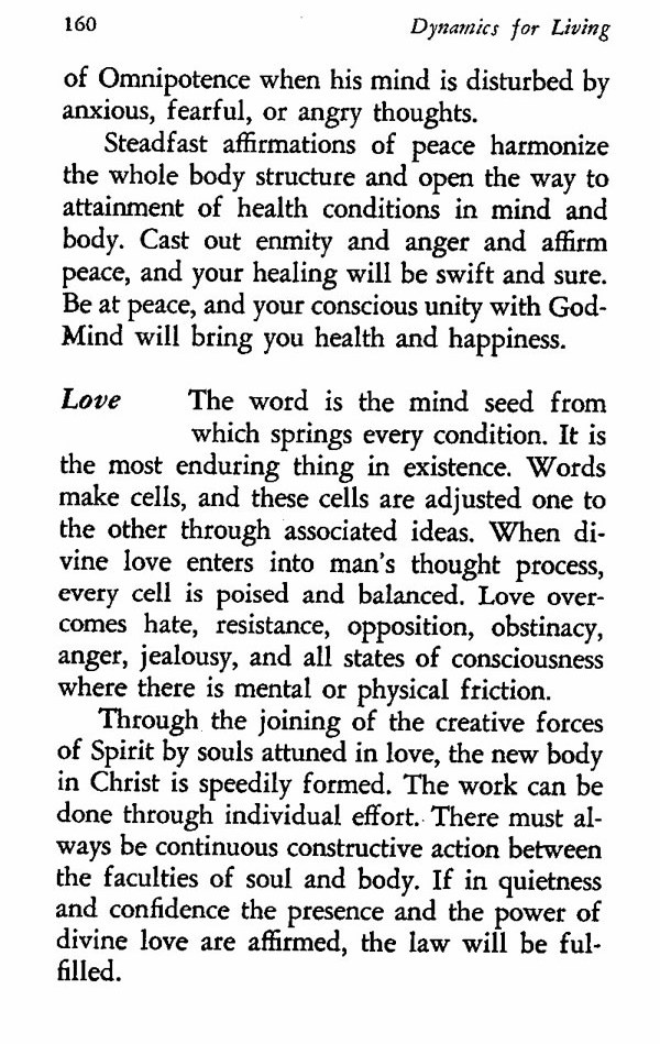 Steadfast affirmations of peace harmonize the whole body structure and open the way to attainment of health conditions in mind and body. Cast out enmity and anger and affirm peace, and your healing will be swift and sure. Be at peace, and your conscious unity with God-Mind will bring you health and happiness.