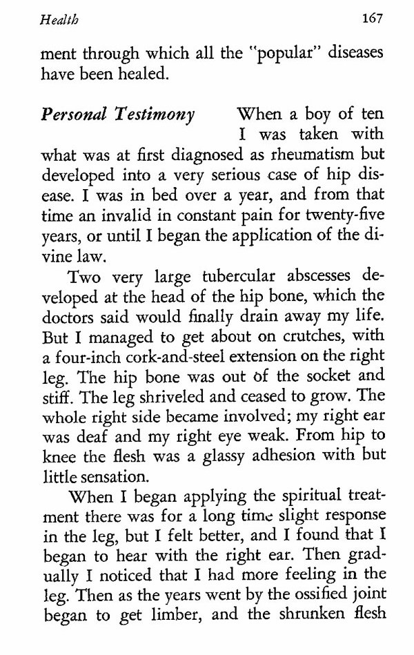 When I began applying the spiritual treatment there was for a long time slight response in the leg, but I felt better, and I found that I began to hear with the right ear. Then gradually I noticed that I had more feeling in the leg. Then as the years went by the ossified joint began to get limber, and the shrunken flesh