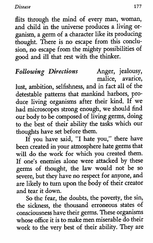 Anger, jealousy, malice, avarice, lust, ambition, selfishness, and in fact all of the detestable patterns that mankind harbors, produce living organisms after their kind. If we had microscopes strong enough, we should find our body to be composed of living germs, doing to the best of their ability the tasks which our thoughts have set before them.
