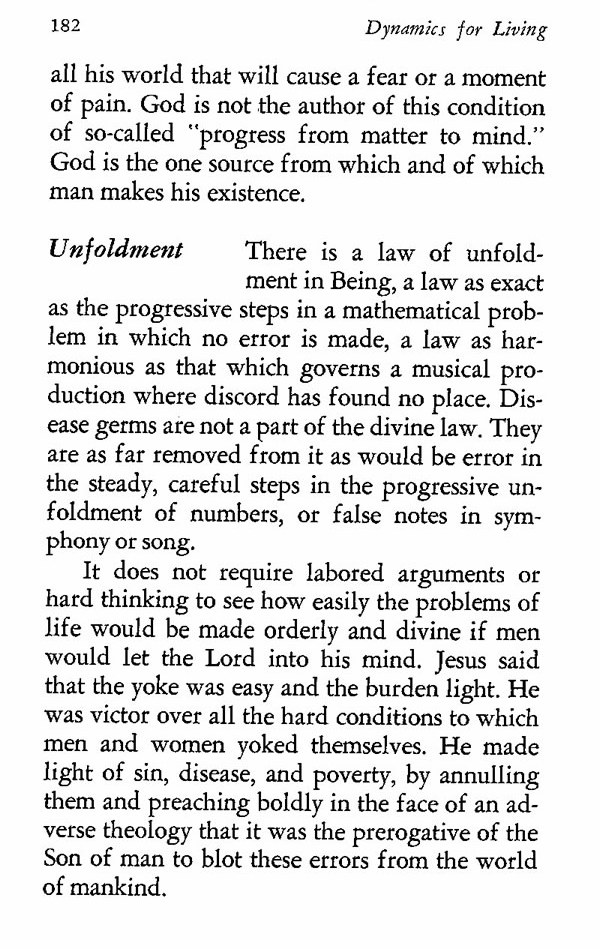 There is a law of unfoldment in Being, a law as exact as the progressive steps in a mathematical problem in which no error is made, a law as harmonious as that which governs a musical production where discord has found no place. Disease germs are not a part of the divine law. They are as far removed from it as would be error in the steady, careful steps in the progressive unfoldment of numbers, or false notes in symphony or song.