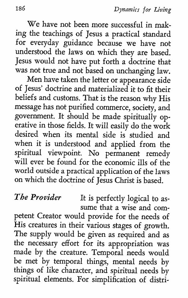 Men have taken the letter or appearance side of Jesus' doctrine and materialized it to fit their beliefs and customs. That is the reason why His message has not purified commerce, society, and government. It should be made spiritually operative in those fields. It will easily do the work desired when its mental side is studied and when it is understood and applied from the spiritual viewpoint. No permanent remedy will ever be found for the economic ills of the world outside a practical application of the laws on which the doctrine of Jesus Christ is based.