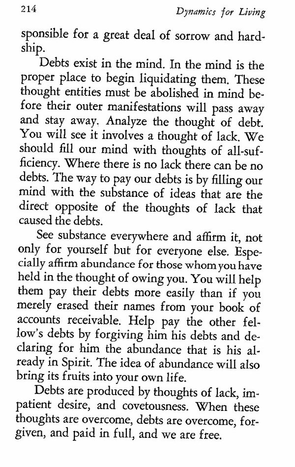 Debts exist in the mind. In the mind is the proper place to begin liquidating them. These thought entities must be abolished in mind before their outer manifestations will pass away and stay away. Analyze the thought of debt. You will see it involves a thought of lack. We should fill our mind with thoughts of all-sufficiency. Where there is no lack there can be no debts. The way to pay our debts is by filling our mind with the substance of ideas that are the direct opposite of the thoughts of lack that caused the debts.