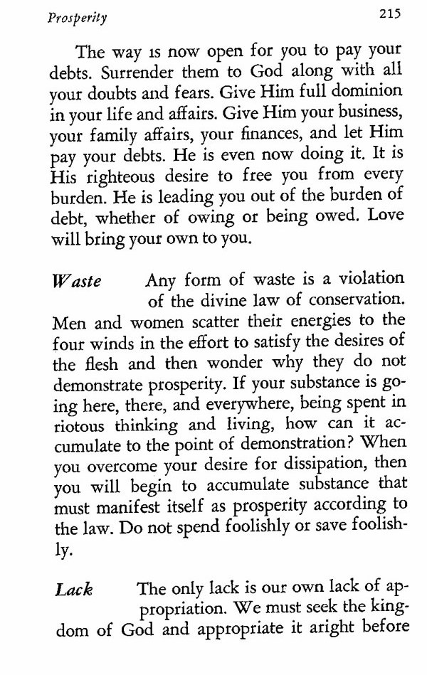 Any form of waste is a violation of the divine law of conservation. Men and women scatter their energies to the four winds in the effort to satisfy the desires of the flesh and then wonder why they do not demonstrate prosperity. If your substance is going here, there, and everywhere, being spent in riotous thinking and living, how can it accumulate to the point of demonstration? When you overcome your desire for dissipation, then you will begin to accumulate substance that must manifest itself as prosperity according to the law. Do not spend foolishly or save foolishly.