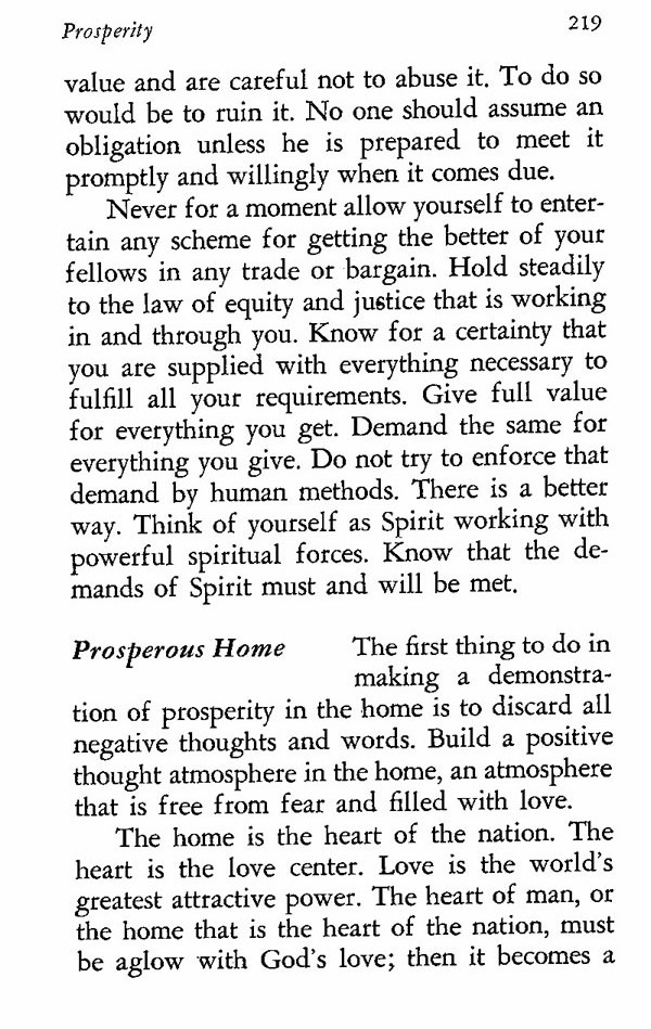 The first thing to do in making a demonstration of prosperity in the home is to discard all negative thoughts and words. Build a positive thought atmosphere in the home, an atmosphere that is free from fear and filled with love.