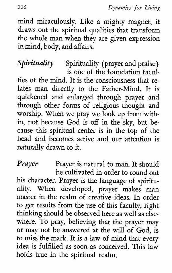 Spirituality (prayer and praise) is one of the foundation faculties of the mind. It is the consciousness that relates man directly to the Father-Mind. It is quickened and enlarged through prayer and through other forms of religious thought and worship. When we pray we look up from within, not because God is off in the sky, but because this spiritual center is in the top of the head and becomes active and our attention is naturally drawn to it.