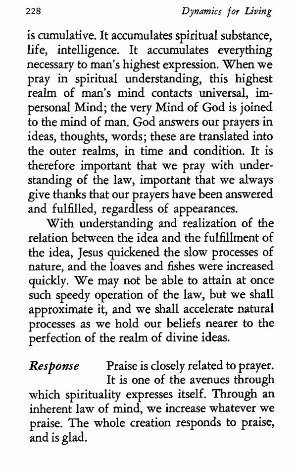 is cumulative. It accumulates spiritual substance, life, intelligence. It accumulates everything necessary to man's highest expression. When we pray in spiritual understanding, this highest realm of man's mind contacts universal, impersonal Mind; the very Mind of God is joined to the mind of man. God answers our prayers in ideas, thoughts, words; these are translated into the outer realms, in time and condition. It is therefore important that we pray with understanding of the law, important that we always give thanks that our prayers have been answered and fulfilled, regardless of appearances.
