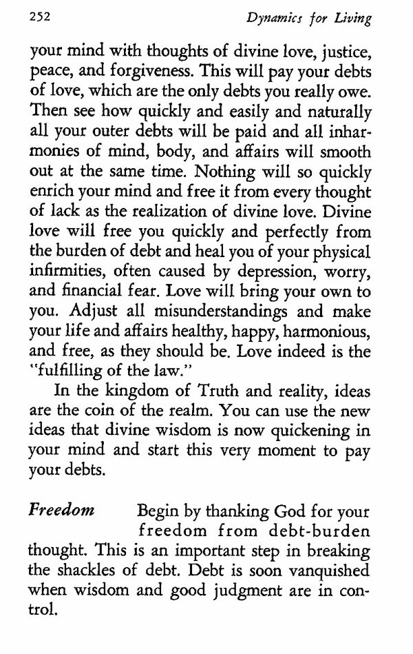 your mind with thoughts of divine love, justice, peace, and forgiveness. This will pay your debts of love, which are the only debts you really owe. Then see how quickly and easily and naturally all your outer debts will be paid and all inharmonies of mind, body, and affairs will smooth out at the same time. Nothing will so quickly enrich your mind and free it from every thought of lack as the realization of divine love. Divine love will free you quickly and perfectly from the burden of debt and heal you of your physical infirmities, often caused by depression, worry, and financial fear. Love will bring your own to you. Adjust all misunderstandings and make your life and affairs healthy, happy, harmonious, and free, as they should be. Love indeed is the "fulfilling of the law."