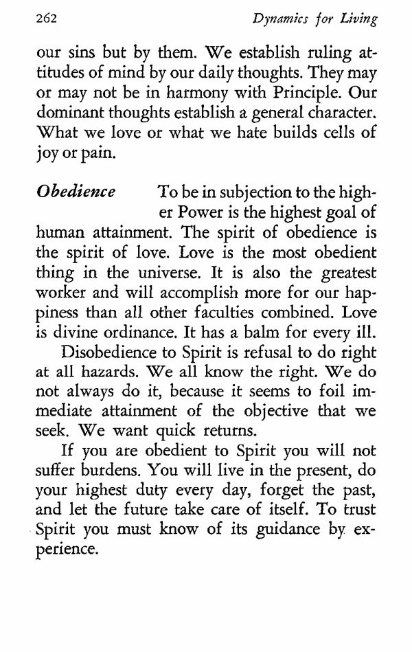 If you are obedient to Spirit you will not suffer burdens. You will live in the present, do your highest duty every day, forget the past, and let the future take care of itself. To trust Spirit you must know of its guidance by experience.