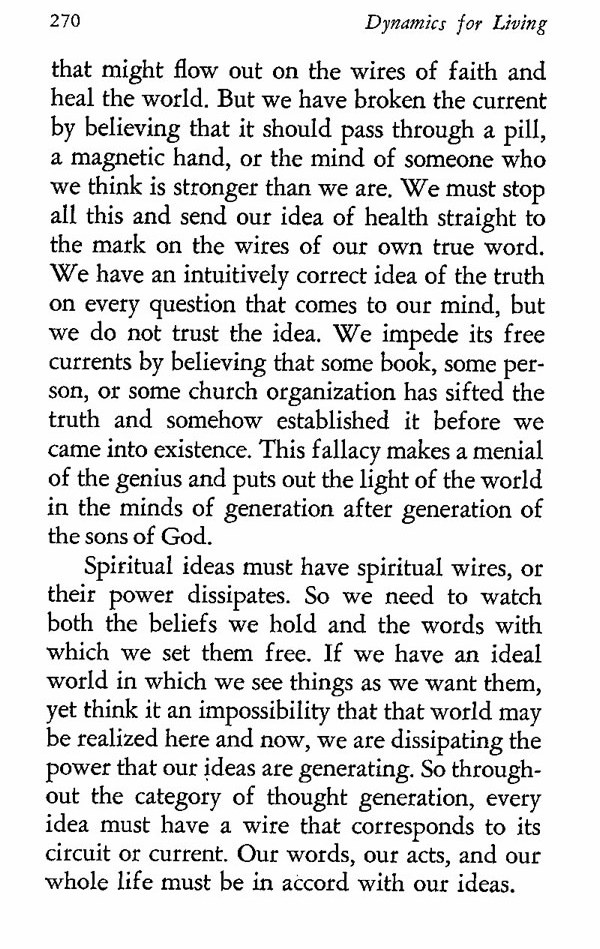 that might flow out on the wires of faith and heal the world. But we have broken the current by believing that it should pass through a pill, a magnetic hand, or the mind of someone who we think is stronger than we are. We must stop all this and send our idea of health straight to the mark on the wires of our own true word. We have an intuitively correct idea of the truth on every question that comes to our mind, but we do not trust the idea. We impede its free currents by believing that some book, some person, or some church organization has sifted the truth and somehow established it before we came into existence. This fallacy makes a menial of the genius and puts out the light of the world in the minds of generation after generation of the sons of God.