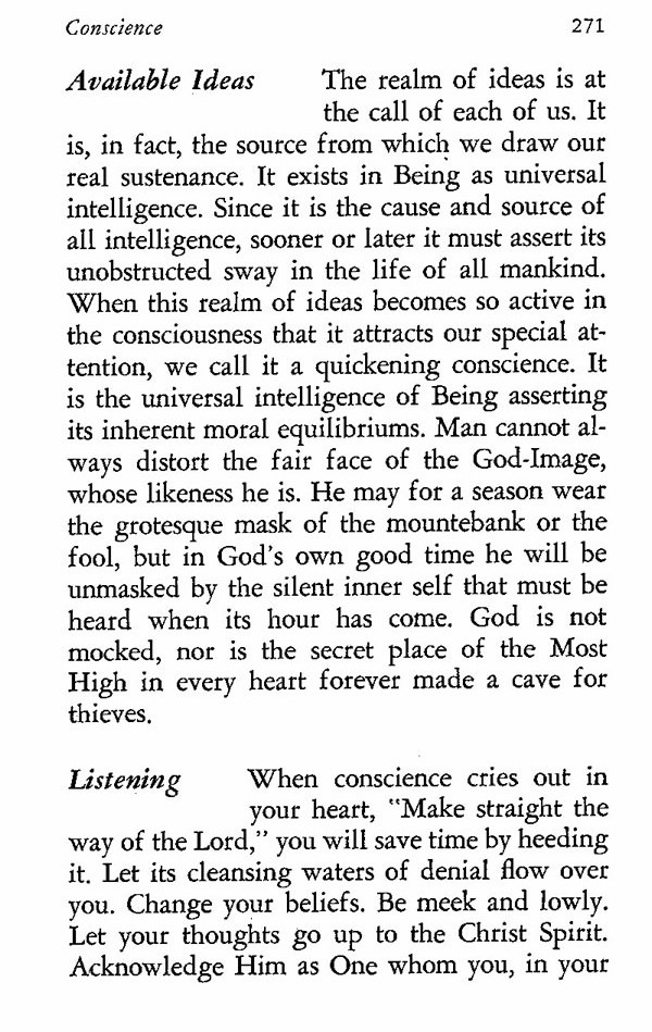 The realm of ideas is at the call of each of us. It is, in fact, the source from which we draw our real sustenance. It exists in Being as universal intelligence. Since it is the cause and source of all intelligence, sooner or later it must assert its unobstructed sway in the life of all mankind. When this realm of ideas becomes so active in the consciousness that it attracts our special attention, we call it a quickening conscience. It is the universal intelligence of Being asserting its inherent moral equilibriums. Man cannot always distort the fair face of the God-Image, whose likeness he is. He may for a season wear the grotesque mask of the mountebank or the fool, but in God's own good time he will be unmasked by the silent inner self that must be heard when its hour has come. God is not mocked, nor is the secret place of the Most High in every heart forever made a cave for thieves.