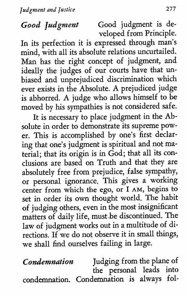 It is necessary to place judgment in the Absolute in order to demonstrate its supreme power. This is accomplished by one's first declaring that one's judgment is spiritual and not material; that its origin is in God; that all its conclusions are based on Truth and that they are absolutely free from prejudice, false sympathy, or personal ignorance. This gives a working center from which the ego, or I AM, begins to set in order its own thought world. The habit of judging others, even in the most insignificant matters of daily life, must be discontinued. The law of judgment works out in a multitude of directions. If we do not observe it in small things, we shall find ourselves failing in large.