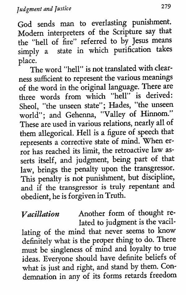 The word "hell" is not translated with clearness sufficient to represent the various meanings of the word in the original language. There are three words from which "hell" is derived: Sheol, "the unseen state"; Hades, "the unseen world"; and Gehenna, "Valley of Hinnom." These are used in various relations, nearly all of them allegorical. Hell is a figure of speech that represents a corrective state of mind. When error has reached its limit, the retroactive law asserts itself, and judgment, being part of that law, brings the penalty upon the transgressor. This penalty is not punishment, but discipline, and if the transgressor is truly repentant and obedient, he is forgiven in Truth.