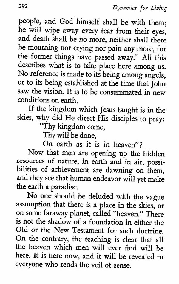 No one should be deluded with the vague assumption that there is a place in the skies, or on some faraway planet, called "heaven." There is not the shadow of a foundation in either the Old or the New Testament for such doctrine. On the contrary, the teaching is clear that all the heaven which men will ever find will be here. It is here now, and it will be revealed to everyone who rends the veil of sense.