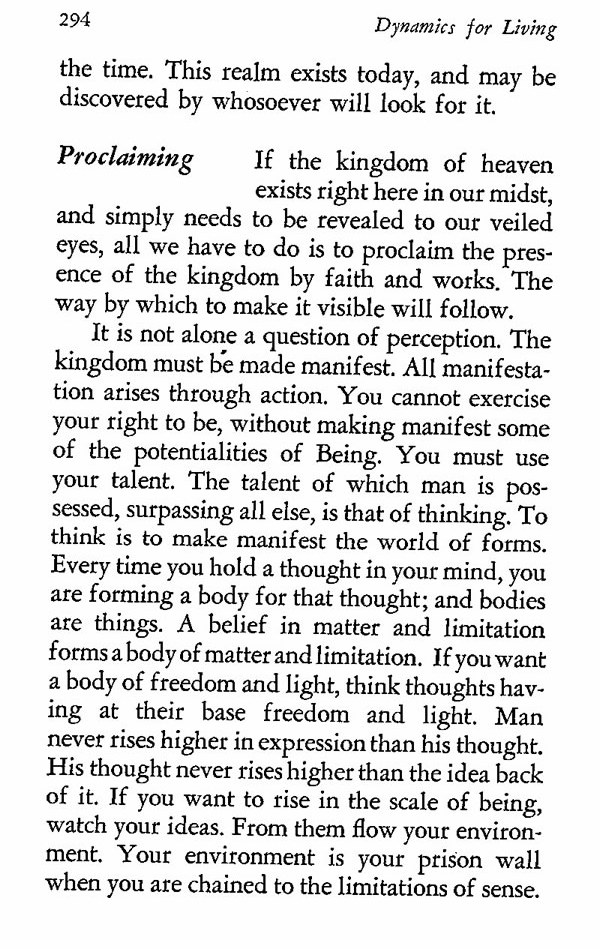It is not alone a question of perception. The kingdom must be made manifest. All manifestation arises through action. You cannot exercise your right to be, without making manifest some of the potentialities of Being. You must use your talent. The talent of which man is possessed, surpassing all else, is that of thinking. To think is to make manifest the world of forms. Every time you hold a thought in your mind, you are forming a body for that thought; and bodies are things. A belief in matter and limitation forms a body of matter and limitation. If you want a body of freedom and light, think thoughts having at their base freedom and light. Man never rises higher in expression than his thought. His thought never rises higher than the idea back of it. If you want to rise in the scale of being, watch your ideas. From them flow your environment. Your environment is your prison wall when you are chained to the limitations of sense.