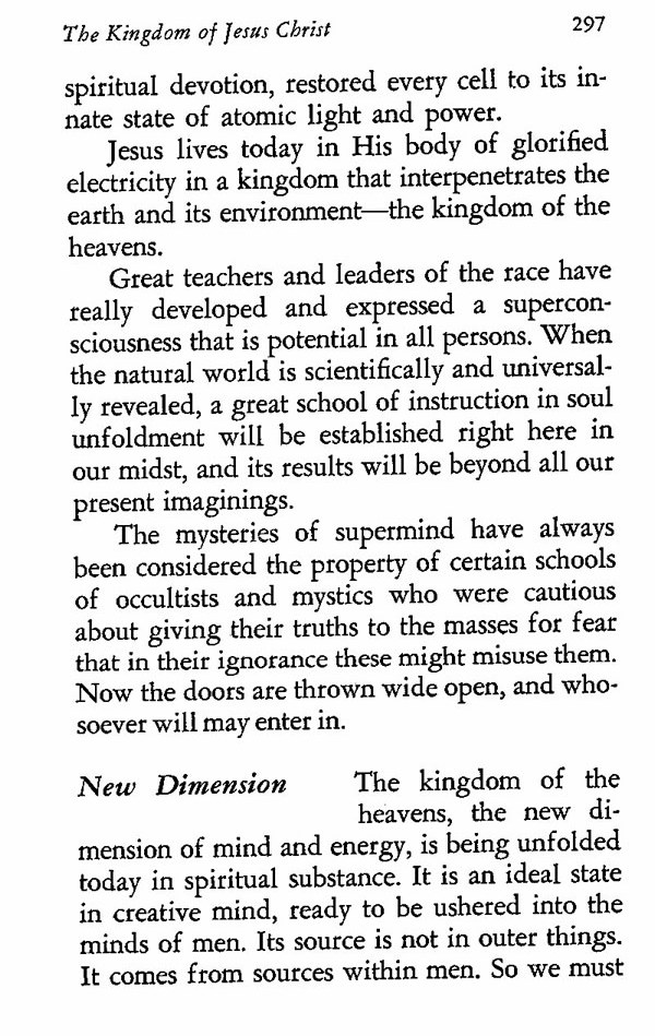 The kingdom of the heavens, the new dimension of mind and energy, is being unfolded today in spiritual substance. It is an ideal state in creative mind, ready to be ushered into the minds of men. Its source is not in outer things. It comes from sources within men. So we must