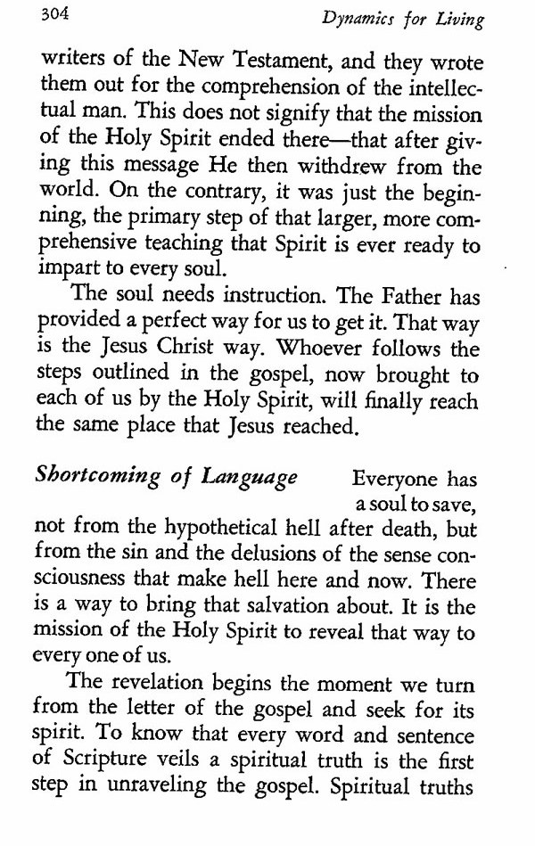 Everyone has a soul to save, not from the hypothetical hell after death, but from the sin and the delusions of the sense consciousness that make hell here and now. There is a way to bring that salvation about. It is the mission of the Holy Spirit to reveal that way to every one of us.