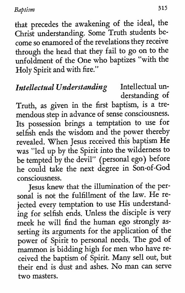 Intellectual understanding of Truth, as given in the first baptism, is a tremendous step in advance of sense consciousness. Its possession brings a temptation to use for selfish ends the wisdom and the power thereby revealed. When Jesus received this baptism He was "led up by the Spirit into the wilderness to be tempted by the devil" (personal ego) before he could take the next degree in Son-of-God consciousness.