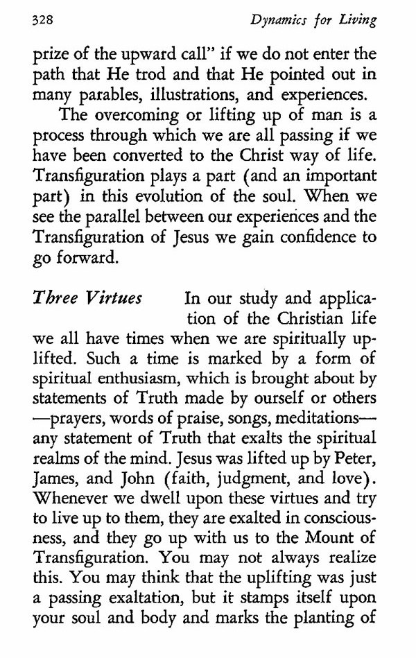 In our study and application of the Christian life we all have times when we are spiritually uplifted. Such a time is marked by a form of spiritual enthusiasm, which is brought about by statements of Truth made by ourself or others --prayers, words of praise, songs, meditations--any statement of Truth that exalts the spiritual realms of the mind. Jesus was lifted up by Peter, James, and John (faith, judgment, and love). Whenever we dwell upon these virtues and try to live up to them, they are exalted in consciousness, and they go up with us to the Mount of Transfiguration. You may not always realize this. You may think that the uplifting was just a passing exaltation, but it stamps itself upon your soul and body and marks the planting of