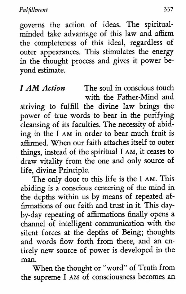 governs the action of ideas. The spiritual-minded take advantage of this law and affirm the completeness of this ideal, regardless of outer appearances. This stimulates the energy in the thought process and gives it power beyond estimate.