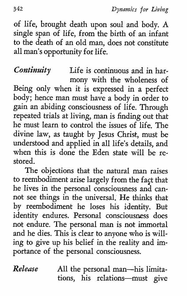 The objections that the natural man raises to reembodiment arise largely from the fact that he lives in the personal consciousness and cannot see things in the universal. He thinks that by reembodiment he loses his identity. But identity endures. Personal consciousness does not endure. The personal man is not immortal and he dies. This is clear to anyone who is willing to give up his belief in the reality and importance of the personal consciousness.