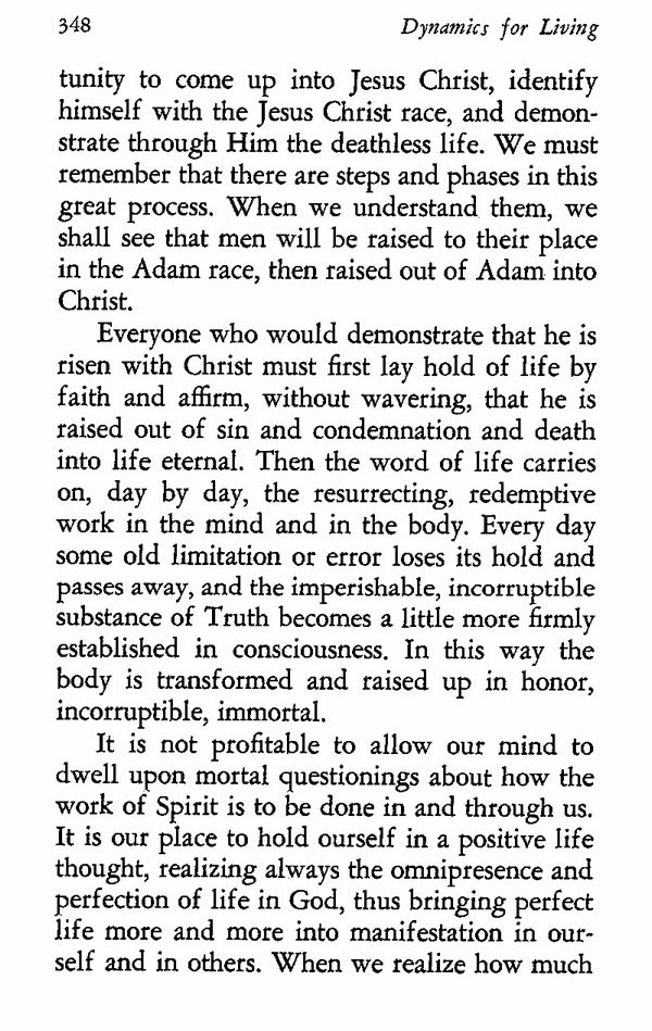 Everyone who would demonstrate that he is risen with Christ must first lay hold of life by faith and affirm, without wavering, that he is raised out of sin and condemnation and death into life eternal. Then the word of life carries on, day by day, the resurrecting, redemptive work in the mind and in the body. Every day some old limitation or error loses its hold and passes away, and the imperishable, incorruptible substance of Truth becomes a little more firmly established in consciousness. In this way the body is transformed and raised up in honor, incorruptible, immortal.
