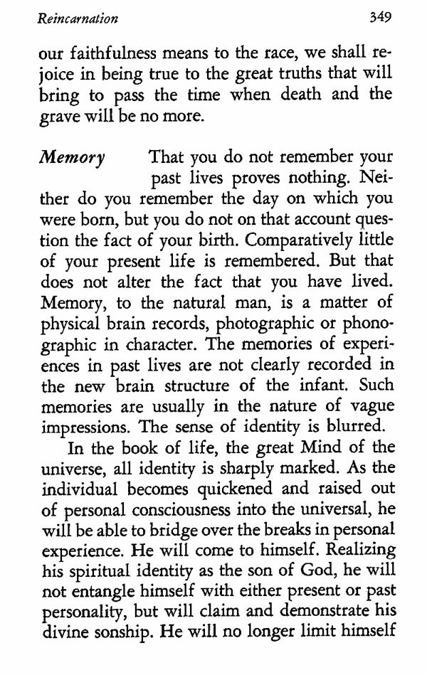 That you do not remember your past lives proves nothing. Neither do you remember the day on which you were born, but you do not on that account question the fact of your birth. Comparatively little of your present life is remembered. But that does not alter the fact that you have lived. Memory, to the natural man, is a matter of physical brain records, photographic or phonographic in character. The memories of experiences in past lives are not clearly recorded in the new brain structure of the infant. Such memories are usually in the nature of vague impressions. The sense of identity is blurred.