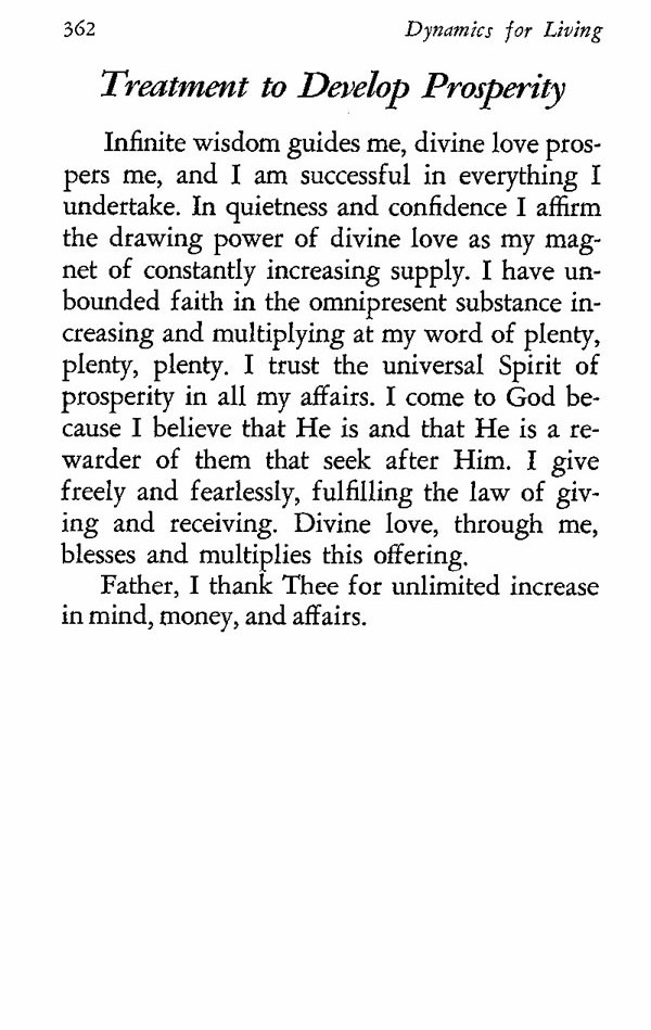 Infinite wisdom guides me, divine love prospers me, and I am successful in everything I undertake. In quietness and confidence I affirm the drawing power of divine love as my magnet of constantly increasing supply. I have unbounded faith in the omnipresent substance increasing and multiplying at my word of plenty, plenty, plenty. I trust the universal Spirit of prosperity in all my affairs. I come to God because I believe that He is and that He is a rewarder of them that seek after Him. I give freely and fearlessly, fulfilling the law of giving and receiving. Divine love, through me, blesses and multiplies this offering.