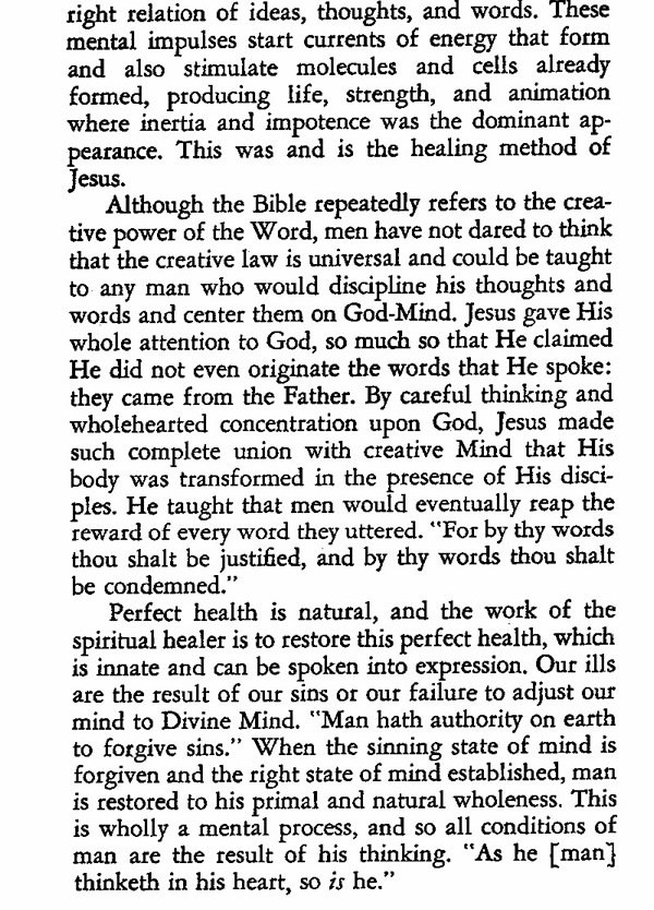 right relation of ideas, thoughts, and words. These mental impulses start currents of energy that form and also stimulate molecules and cells already formed, producing life, strength, and animation where inertia and impotence was the dominant appearance. This was and is the healing method of Jesus.