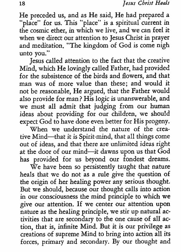 We have been so persistently taught that nature heals that we do not as a rule give the question of the origin of her healing power any serious thought. But we should, because our thought calls into action in our consciousness the mind principle to which we give our attention. If we center our attention on nature as the healing principle, we stir up natural activities that are secondary to the one cause of all action, that is, infinite Mind. But it is our privilege as creations of supreme Mind to bring into action all its forces, primary and secondary. By our thought and