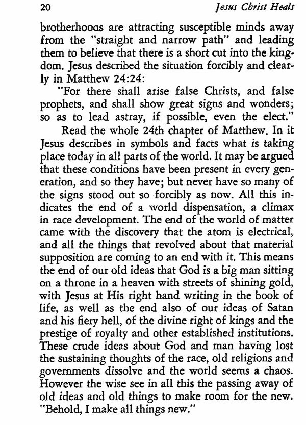 Read the whole 24th chapter of Matthew. In it Jesus describes in symbols and facts what is taking place today in all parts of the world. It may be argued that these conditions have been present in every generation, and so they have; but never have so many of the signs stood out so forcibly as now. All this indicates the end of a world dispensation, a climax in race development. The end of the world of matter came with the discovery that the atom is electrical, and all the things that revolved about that material supposition are coming to an end with it. This means the end of our old ideas that God is a big man sitting on a throne in a heaven with streets of shining gold, with Jesus at His right hand writing in the book of life, as well as the end also of our ideas of Satan and his fiery hell, of the divine right of kings and the prestige of royalty and other established institutions. These crude ideas about God and man having lost the sustaining thoughts of the race, old religions and governments dissolve and the world seems a chaos. However the wise see in all this the passing away of old ideas and old things to make room for the new. "Behold, I make all things new."