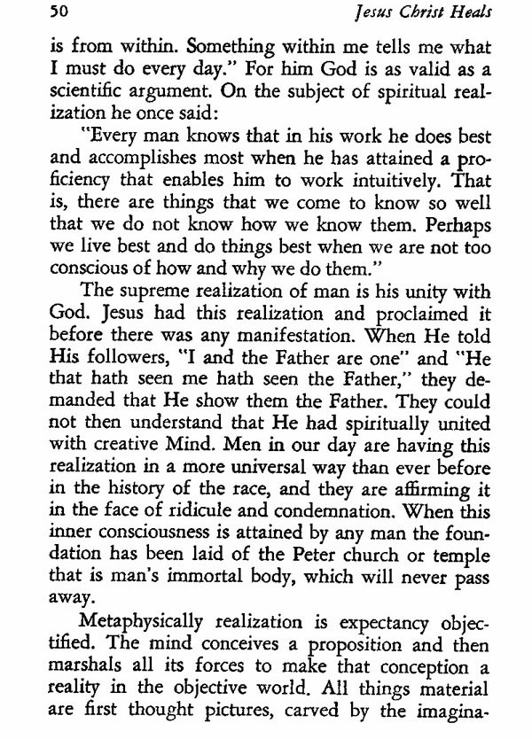 The supreme realization of man is his unity with God. Jesus had this realization and proclaimed it before there was any manifestation. When He told His followers, "I and the Father are one" and "He that hath seen me hath seen the Father," they demanded that He show them the Father. They could not then understand that He had spiritually united with creative Mind. Men in our day are having this realization in a more universal way than ever before in the history of the race, and they are affirming it in the face of ridicule and condemnation. When this inner consciousness is attained by any man the foundation has been laid of the Peter church or temple that is man's immortal body, which will never pass away.