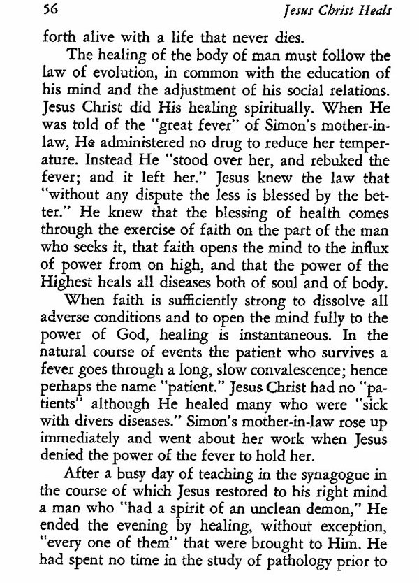 The healing of the body of man must follow the law of evolution, in common with the education of his mind and the adjustment of his social relations. Jesus did His healing spiritually. When He was told of the "great fever" of Simon's mother-in-law, He administered no drug to reduce her temperature. Instead He "stood over her, and rebuked the fever; and it left her." Jesus knew the law that "without any dispute the less is blessed by the better." He knew that the blessing of health comes through the exercise of faith on the part of the man who seeks it, that faith opens the mind to the influx of power from on high, and that the power of the Highest heals all diseases both of soul and of body.