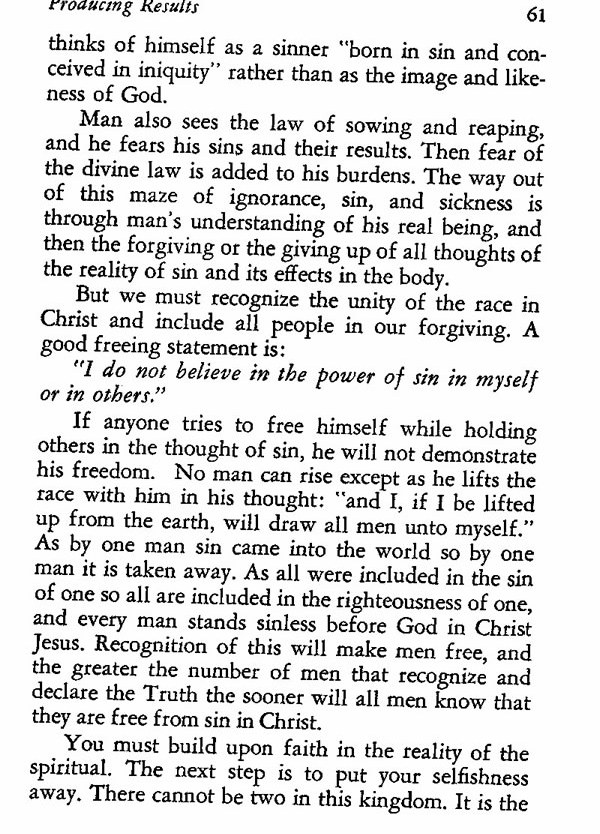 If anyone tries to free himself while holding others in the thought of sin, he will not demonstrate his freedom. No man can rise except as he lifts the race with him in his thought: "and I, if I be lifted up from the earth, will draw all men unto myself." As by one man sin came into the world so by one man it is taken away. As all were included in the sin of one so all are included in the righteousness of one, and every man stands sinless before God in Christ. Recognition of this will make men free, and the greater the number of men that recognize and declare the Truth the sooner will all men know that they are free from sin in Christ.