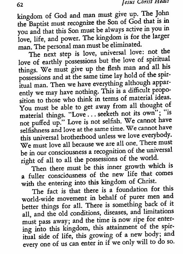 The next step is love, universal love: not the love of earthly possessions but the love of spiritual things. We must give up the flesh man and all his possessions and at the same time lay hold of the spiritual man. Then we have everything although apparently we may have nothing. This is a difficult proposition to those who think in terms of material ideas. You must be able to get away from all thought of material things. "Love . . . seeketh not its own"; "is not puffed up." Love is not selfish. We cannot have selfishness and love at the same time. We cannot have this universal brotherhood unless we love everybody. We must love all because we are all one. There must be in our consciousness a recognition of the universal right of all to all the possessions of the world.