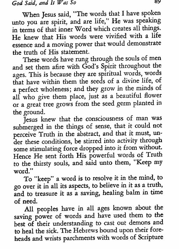 When Jesus said, "The words that I have spoken unto you are spirit, and are life," He was speaking in terms of that inner Word which creates all things. He knew that His words were vivified with a life essence and a moving power that would demonstrate the truth of His statement.