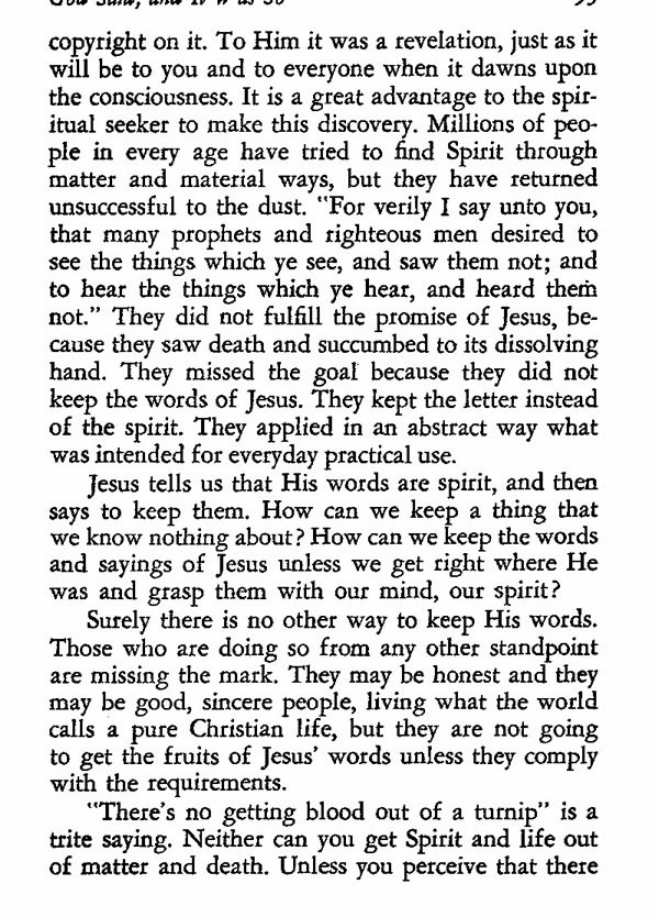 will be to you and to everyone when it dawns on the consciousness. It is a great advantage to the spiritual seeker to make this discovery. Millions of persons in every age have tried to find Spirit through matter and material ways, but they have returned unsuccessful to the dust. "For verily I say unto you, that many prophets and righteous men desired to see the things which ye see, and saw them not; and to hear the things which ye hear, and heard them not." They did not fulfill the promise of Jesus, because they saw death and succumbed to its dissolving hand. They missed the goal because they did not keep the words of Jesus. They kept the letter instead of the spirit. They applied in an abstract way what was intended for everyday practical use.